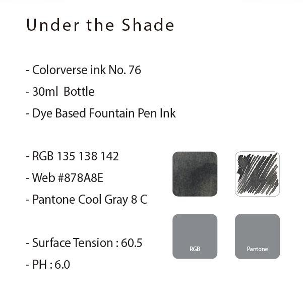 Bir adet 30 ml'lik Under The Shade mürekkebi şişesi. Boya Bazlı Dolma Kalem Mürekkebi PH: 6.0 Soğuk Gri
